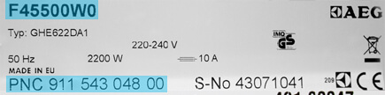 Eksempel på typeskilt på en AEG opvaskemaskine. Modelnummeret du skal bruge er markeret med blå:
