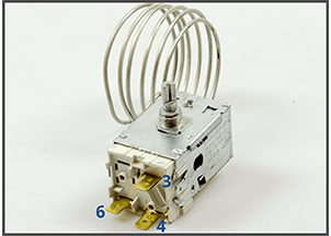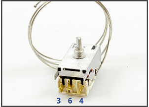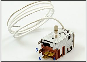 Termostaten er i virkeligheden blot en afbryder, som kan tænde og slukke. Det vil sige, at den enten tillader strømmen at passere igennem til kompressoren (motoren) eller afbryder den. Ofte er der et strømudtag til lampen i skabet fra termostaten. Der er normalt 3 strømklemmer på termostaten (markeret med tallene 1- 2 - 3 eller 3 - 4 - 6). Tallene kan have forskellig betydning fra producent til producent - som forklaret i afsnittet ovenfor.
