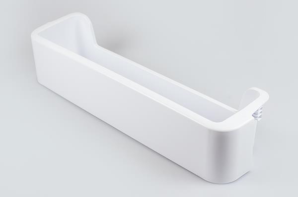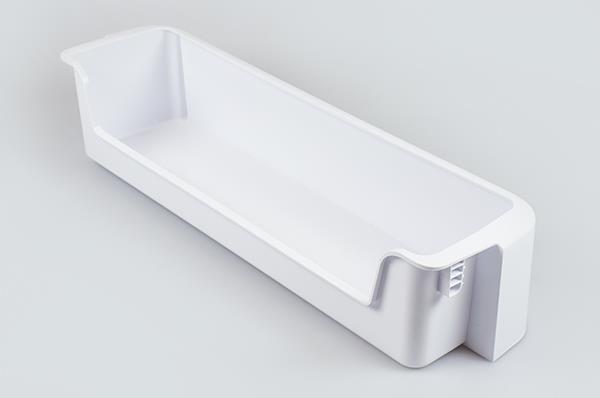 Nedre hylde i køleskabsdør, ofte anvendt som mælkehylde. Dørhylden kan nemt udskiftes uden brug af værktøj.
