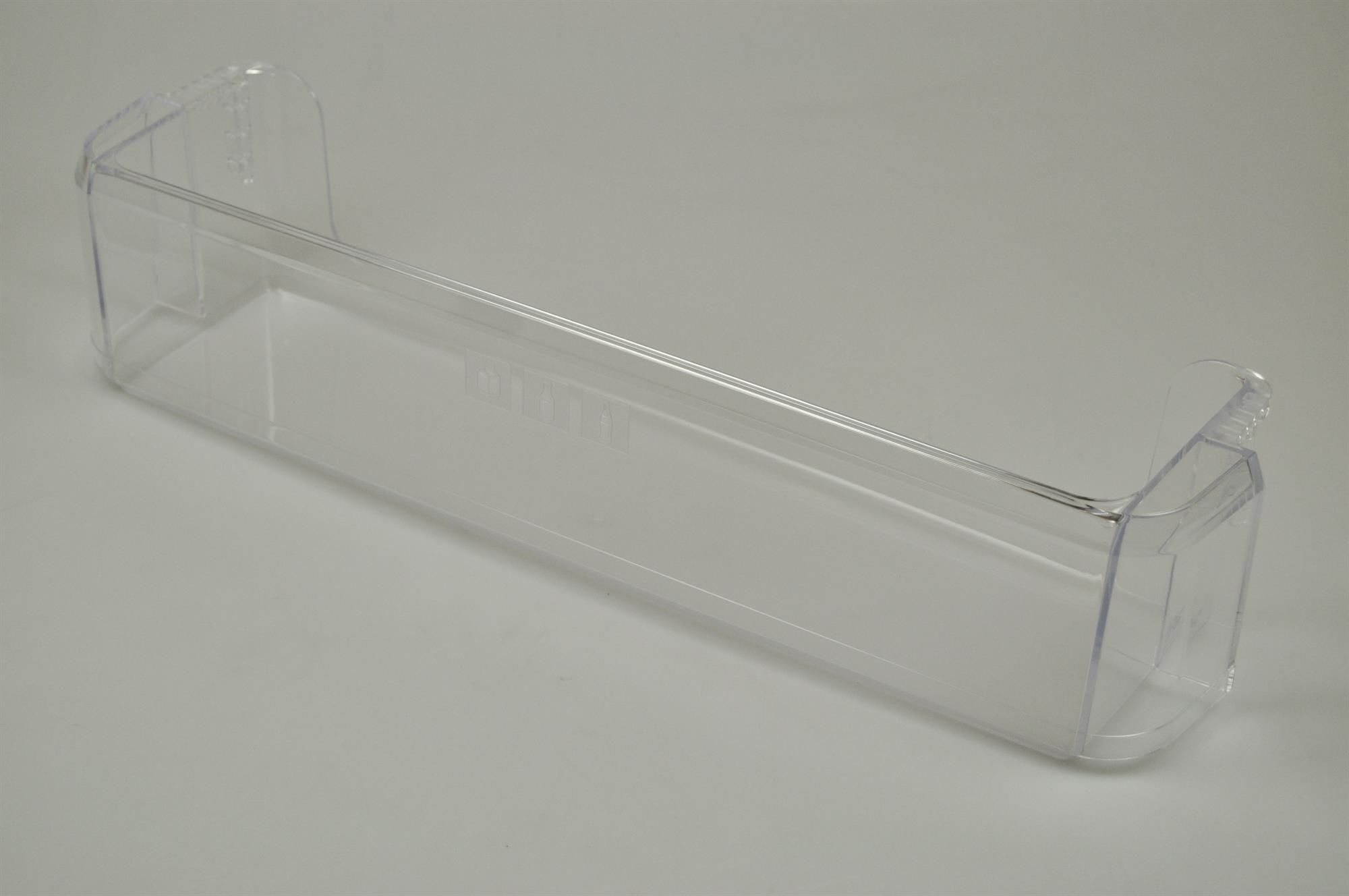 Nedre hylde i køleskabsdør, ofte anvendt som mælkehylde. Dørhylden kan nemt udskiftes uden brug af værktøj.