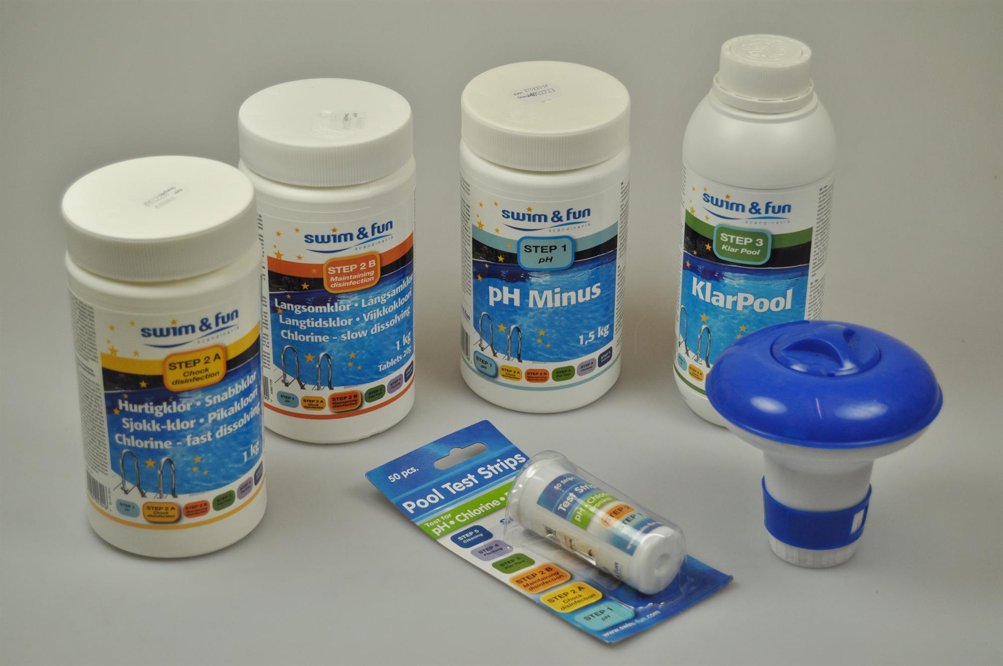 Brug disse til at teste pH-værdien og indholdet af klor I vandet. Beholderen har påklistret skala, så du nemt kan aflæse resultatet.