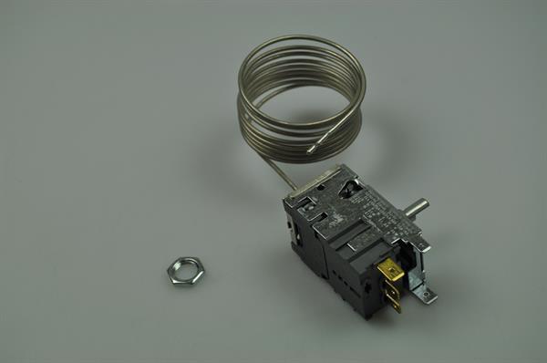 Denne termostat er til køleafdelingen. Ved regulering af køletermostaten opretholdes den ønskede temperatur i køleskabet - jo højere der skrues op for termostaten, desto koldere bliver der i køleskabet.